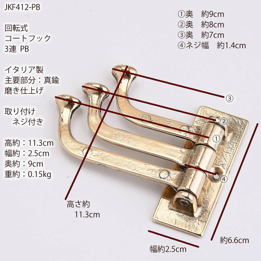 イタリア製真鍮フック コートフック コート掛け 真鍮製品 小型フック 【石膏ボード、タイル石材、取り付け対応】 【メール便発送対応¥250】 真鍮装飾タオルコートフック (3連回転フック-PB)(JKF412-PB)【RCP】【asu】【P】